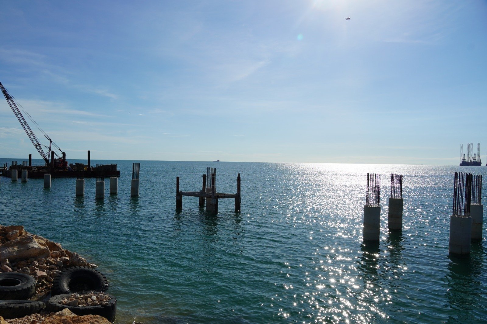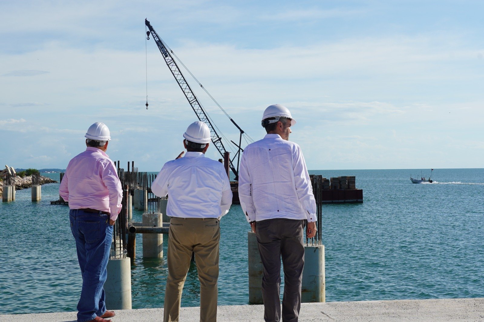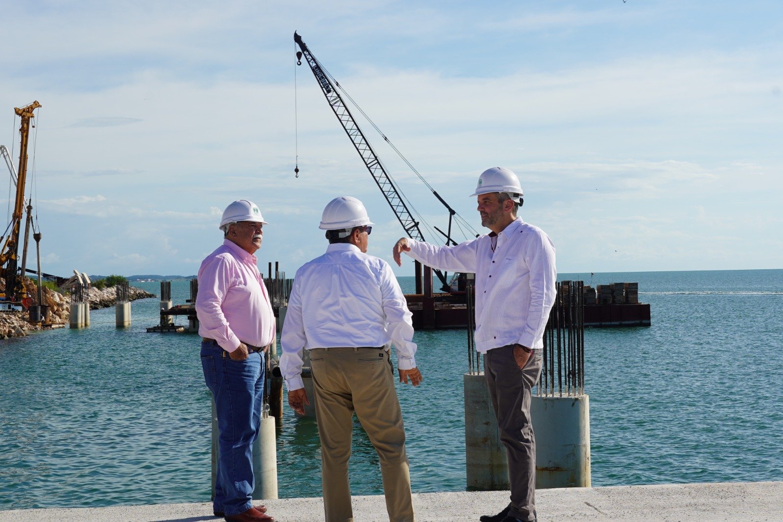 El Secretario de Desarrollo Económico, Jorge Luis Lavalle Maury, supervisó el avance de la construcción de los duques de alba en el puerto de Seybaplaya, durante una visita controlada y sin operación activa.