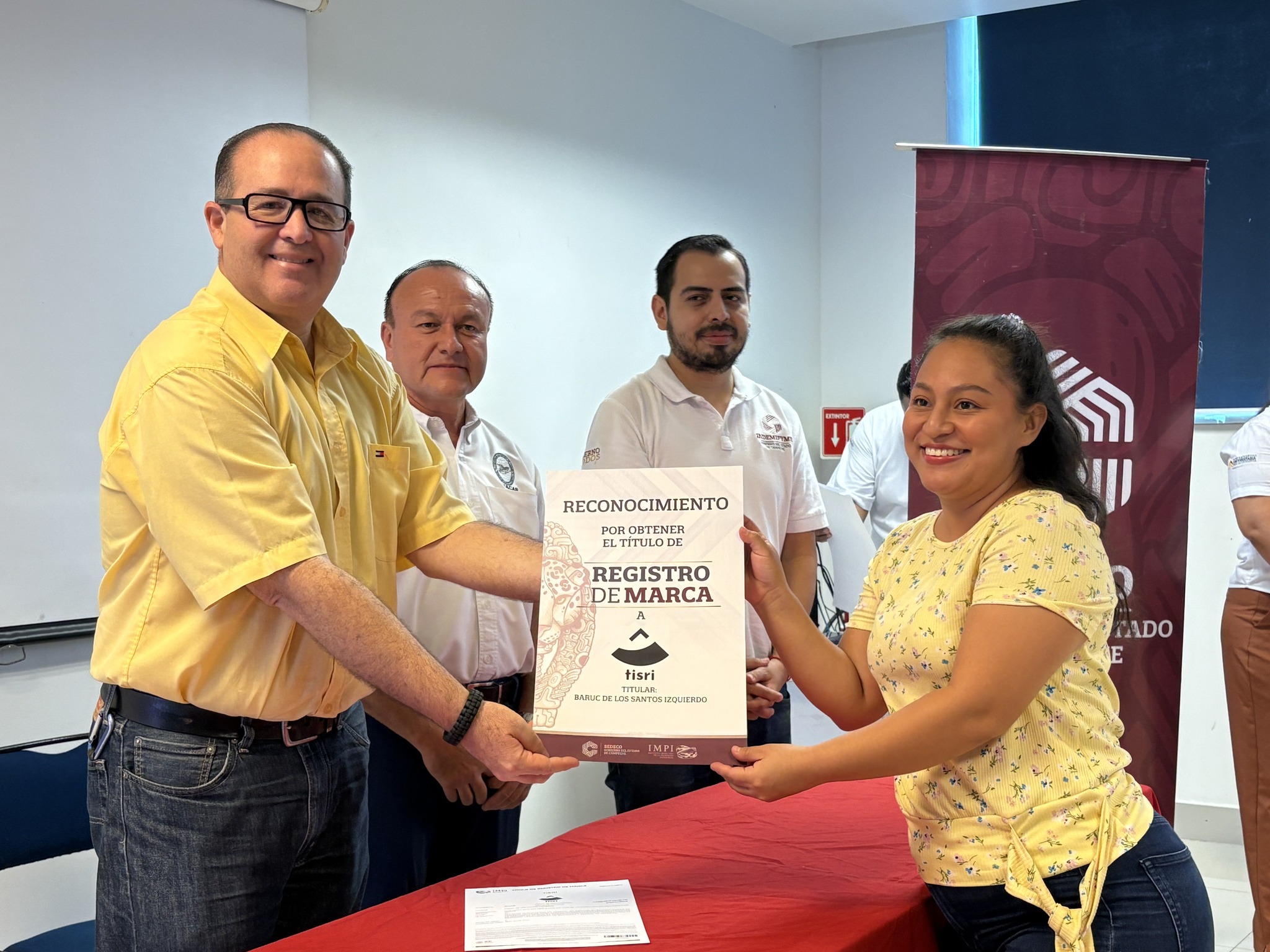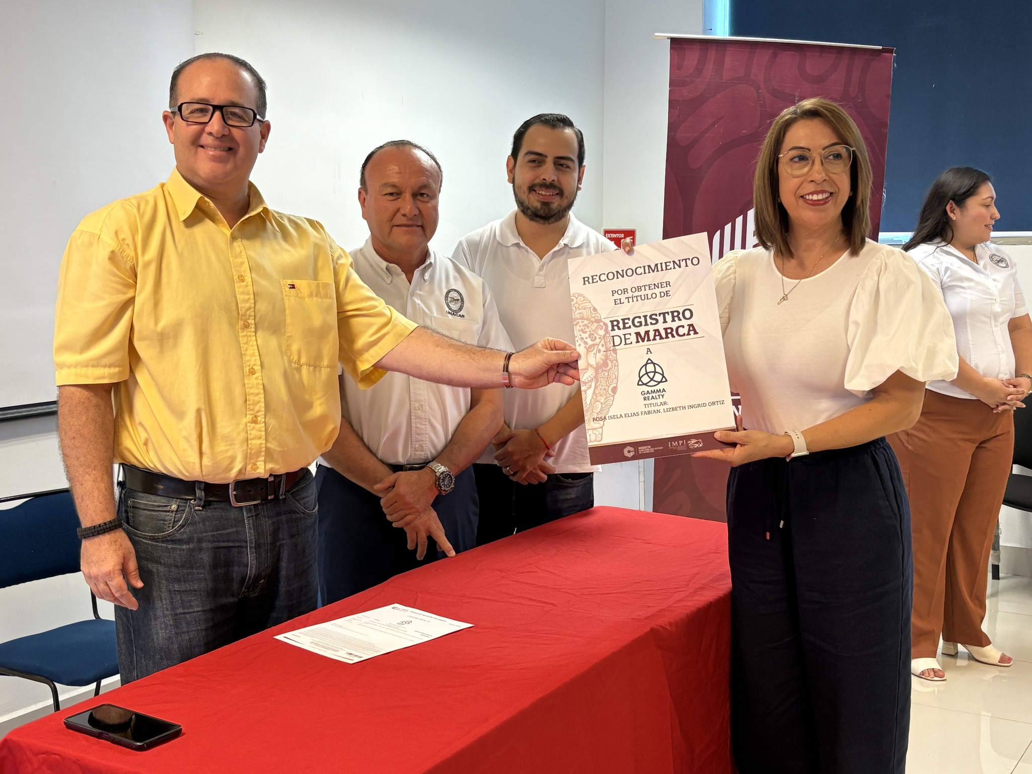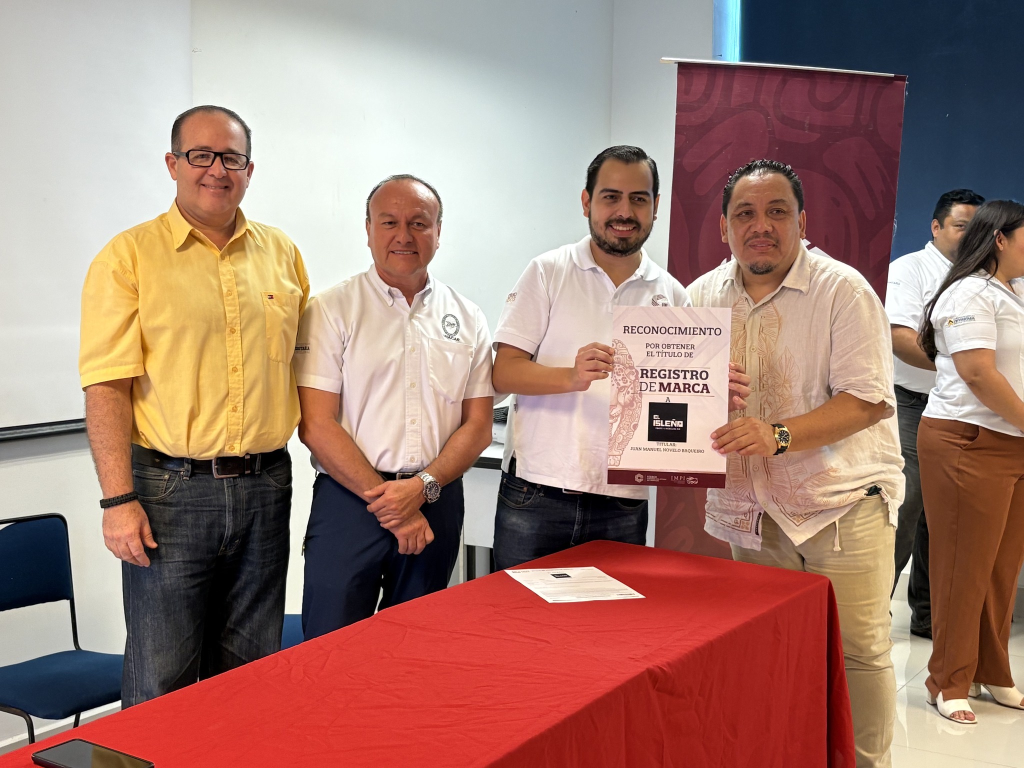 Recibieron su Título de registro de marca: Margarita Torres Reyes, de La estancia de Minna y Net; Analid Monserrat Hernández Aparicio, de Aula 33, Peymont Fel y Peymont Espacio Inmobiliario; Juan Manuel Novelo Baqueiro, de El Isleño; Wendy Nayeli Madrigal Chablé, de Piquito Dorado; Yazmin Sorcia Hernández, de Sorcia Joyería; Mayra Guillermina Zamora Quevedo, de Cacao Dorado; Adriana Josefa Ruiz Perera, de Adriss Shop; Jennifer Razo Lizárraga, de Lizárraga Bisutería; Rosa Isela Elías Fabián, de Gamma Realty; Luis Alfonso Pou Reina, de El Carmelo de Sonora; Martha Elena Álvarez Osorio, de Martelitas; Raúl Roberto Aliaga, de Sealmex; Julia Martínez Guzmán, de Dulce Yulie; Carlos Ademir Castro Ortiz, de Casort; Gabriel Mendoza Alvarado, de Auto&Motor MAG; Melissa Xacur Zaldivar, de Meliciozuras y Meliciosas; Jesús Gualberto Pech López, de Colecticon; Verónica Calderón, de Alta Costura Isla; Baruc delos Santos Izquierdo, de Tisri; María Esther Cruz López, de Ceficar; Jesús Espinosa Damas, de SEPONAV Servicios Portuarios y Navieros del Golfo; Margarita Méndez Zamora, de Segenfrau; Olimpia Estrada Álvarez, RanchOli; Álvaro José Hernández Pérez, Carmen, La Isla del Pirata; y Carla Patricia Evia Novelo, de Torito Isleño.