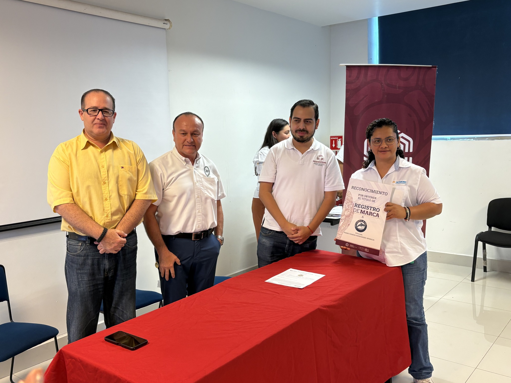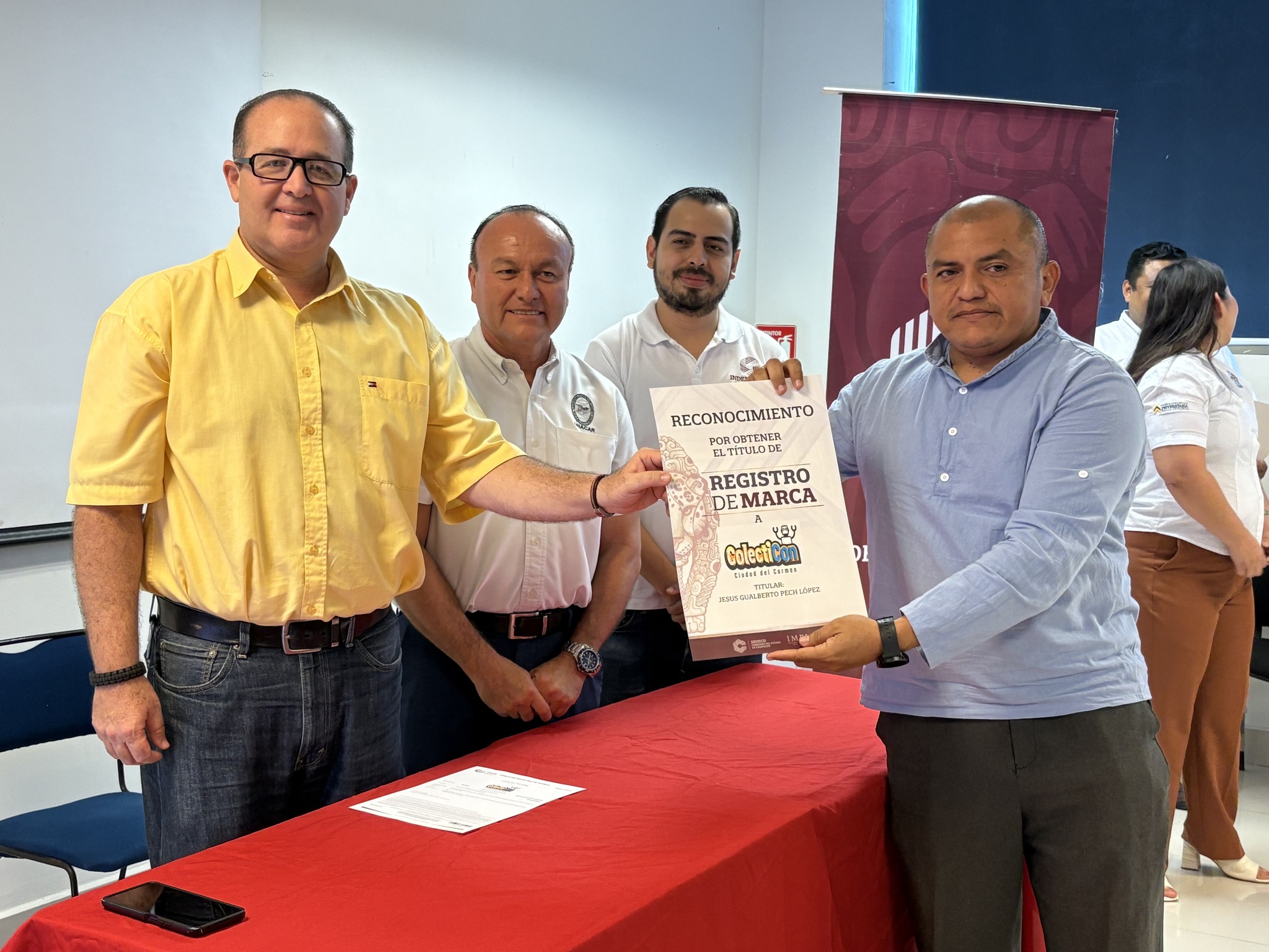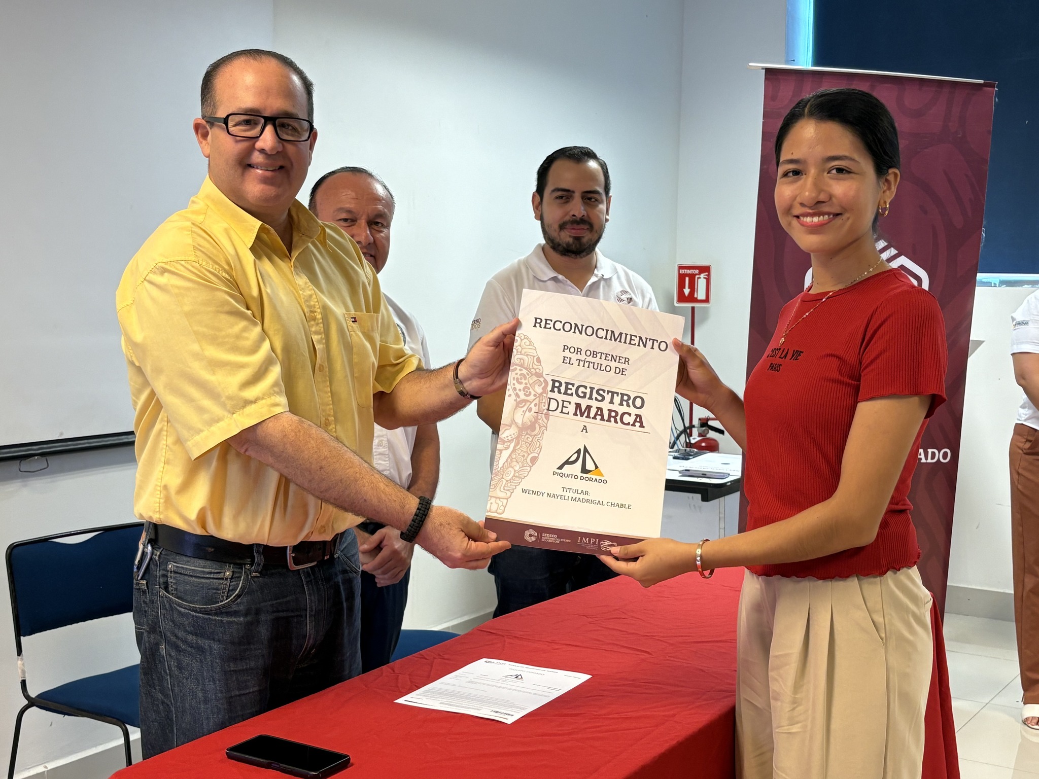 Recibieron su Título de registro de marca: Margarita Torres Reyes, de La estancia de Minna y Net; Analid Monserrat Hernández Aparicio, de Aula 33, Peymont Fel y Peymont Espacio Inmobiliario; Juan Manuel Novelo Baqueiro, de El Isleño; Wendy Nayeli Madrigal Chablé, de Piquito Dorado; Yazmin Sorcia Hernández, de Sorcia Joyería; Mayra Guillermina Zamora Quevedo, de Cacao Dorado; Adriana Josefa Ruiz Perera, de Adriss Shop; Jennifer Razo Lizárraga, de Lizárraga Bisutería; Rosa Isela Elías Fabián, de Gamma Realty; Luis Alfonso Pou Reina, de El Carmelo de Sonora; Martha Elena Álvarez Osorio, de Martelitas; Raúl Roberto Aliaga, de Sealmex; Julia Martínez Guzmán, de Dulce Yulie; Carlos Ademir Castro Ortiz, de Casort; Gabriel Mendoza Alvarado, de Auto&Motor MAG; Melissa Xacur Zaldivar, de Meliciozuras y Meliciosas; Jesús Gualberto Pech López, de Colecticon; Verónica Calderón, de Alta Costura Isla; Baruc delos Santos Izquierdo, de Tisri; María Esther Cruz López, de Ceficar; Jesús Espinosa Damas, de SEPONAV Servicios Portuarios y Navieros del Golfo; Margarita Méndez Zamora, de Segenfrau; Olimpia Estrada Álvarez, RanchOli; Álvaro José Hernández Pérez, Carmen, La Isla del Pirata; y Carla Patricia Evia Novelo, de Torito Isleño.